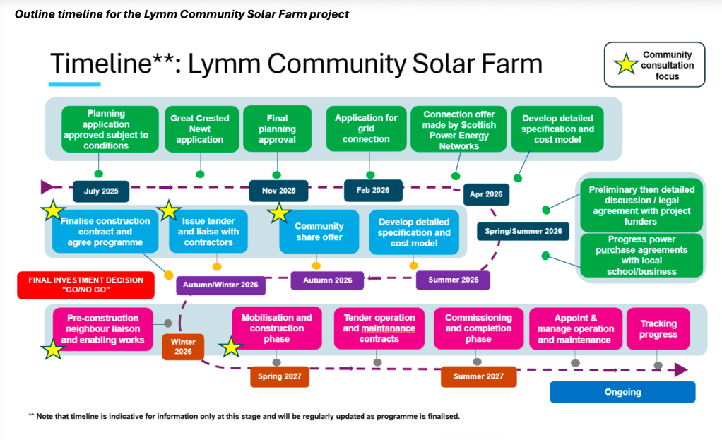 Timing of the project depends on the achievement of various consents, from ecology through to electrical network connection. Assembling the required funding and agreeing energy supply contracts with local businesses will also take some time. A draft timeline for the project is shown below, with key milestones highlighted.